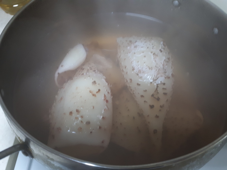 Размороженные тушки, НЕ ЧИСТЯ, кидаем в кипящую подсоленую воду.