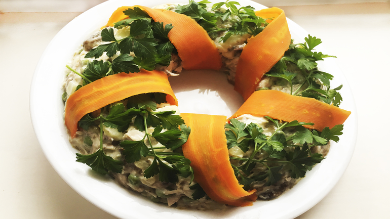 Взять тарелку, на середину поставить стакан, вокруг него выложить салат. Для украшения венка достаточно плотно укладываем петрушку по поверхности салата. Наряжаем наш веночек: нарезаем морковь на очень тонкие ломтики овощечисткой. Укладываем ленты моркови через равные промежутки.