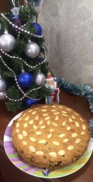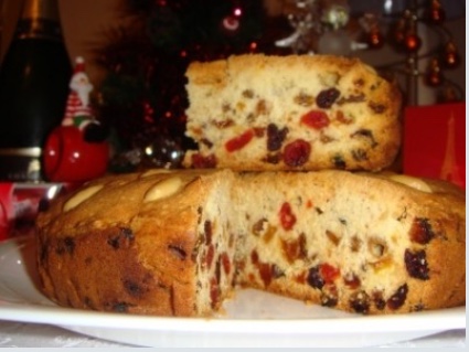 470г сухофруктов (140г светлого изюма , 140г темного изюма, 50г цукатов, 70г сушеной клюквы, 70г сушеной вишни) - 70г рома (или коньяка) - 200г сливочного масла, - 4 яйца, - 220г сахара, - 250г муки, - 1/2 ч.л. разрыхлителя - 50г молотого миндаля - цедра одного лимона - 50г очищенного миндаля для украшения - Сухофрукты заранее поместить в емкость, залить ромом, закрыть крышкой и оставить на ночь, лучше на сутки, емкость периодически встряхивать, чтобы впитался весь ром. Для того, чтобы структура кекса была более однородной без пустот, крупные сухофрукты можно порезать на кусочки одинакового размера. - Яйца и масло вынуть из холодильника за несколько часов до приготовления теста, чтобы они согрелись до комнатной температуры. - Форму смазать маслом и застелить бумагой для выпечки так, чтобы бумага торчала над краями формы, чтобы верх кекса не обгорал, а кекс после выпечки и остывания легко можно было вынуть из формы. Взбить мягкое масло с сахаром, добавить по одному яйца, тщательно взбивая, всыпать постепенно муку, смешанную с разрыхлителем, цедрой лимона и молотым миндалем. Отделить небольшое количество теста, им потом намазать верх теста с сухофруктами, прежде чем поставить его в духовку, это предохранит сухофрукты от обгорания во время выпечки. Сухофрукты слегка обвалять в муке и добавить к основному тесту, хорошо перемешать, что бы сухофрукты равномерно распределились по тесту . выложить тесто в подготовленную форму, сверху выложить порцию теста без сухофруктов, разровнять поверхность и сверху разложить очищенный миндаль, постучать формой с тестом о стол, удаляя этим пузырьки воздуха. Печь в разогретой духовке при 165С градусах примерно 1,5 -2 часа, проверяя готовность деревянной палочкой, если кекс начнет пригорать, следует накрыть его фольгой. Вытащить кекс из духовки, можно слегка его сбрызнуть алкоголем, накрыть бумагой и остудить полностью, после чего вынуть из формы, герметично упаковать в пергамент и убрать на хранение... недели на 2-3 (…или до Рождества) .На фото кекс, который созревал 3 недели.