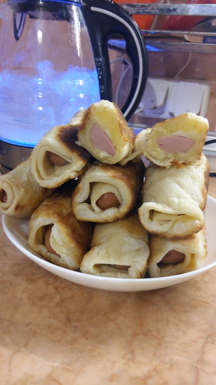 Имеется: бездрожевое слоеное готовое тесто, сосиски и картофельное пюре. Духовки нет, только жарка на сковороде. Пожарила, вкуснотища!!! Очень вкусное это тесто. Ещё добавила сыр внутрь.