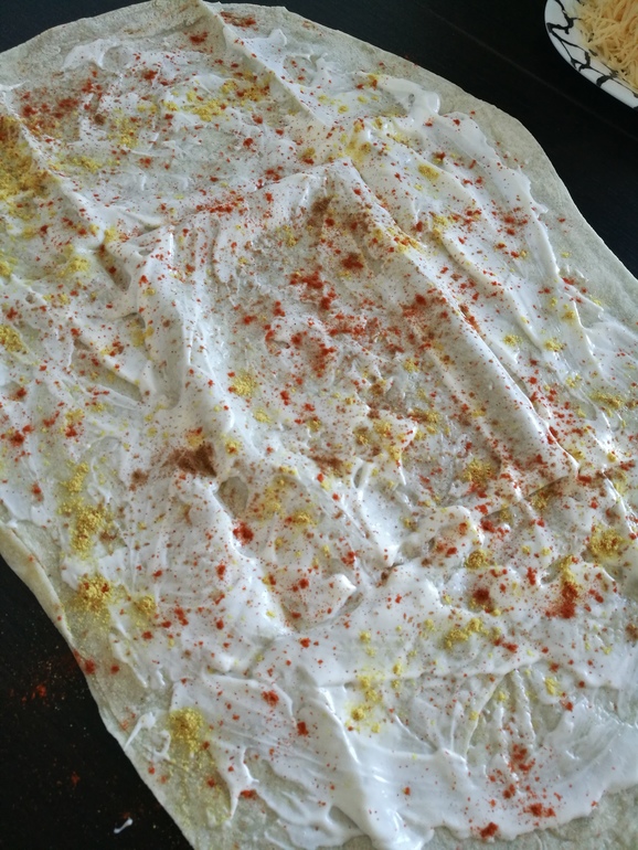 Лаваш мажем густо соусом, (я еще паприкой для цвета присыпаю)