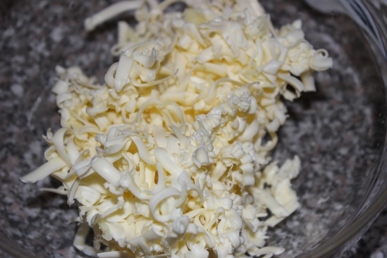 Масла трём на крупной тёрке, смешиваем с мукой и добавляем разрыхлитель: