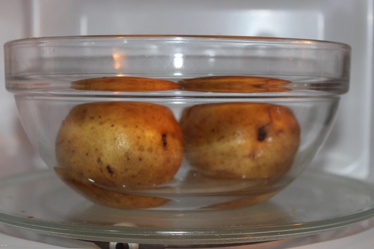 Картофель я отваривала в микроволновой печи. Протыкаем зубочисткой картофель и ставим в специальной посуде на 8 минут.