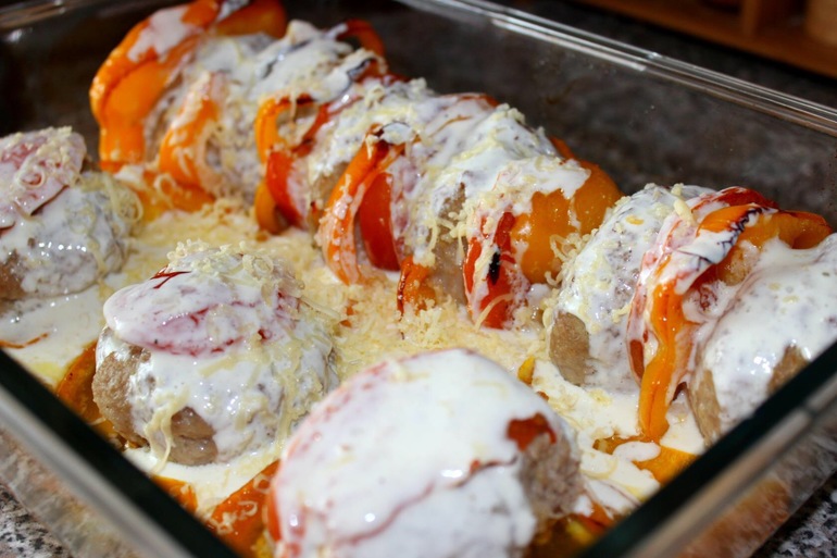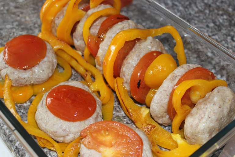 Выкладываем в форму перец-помидор-котлета и так чередуем гармошкой: