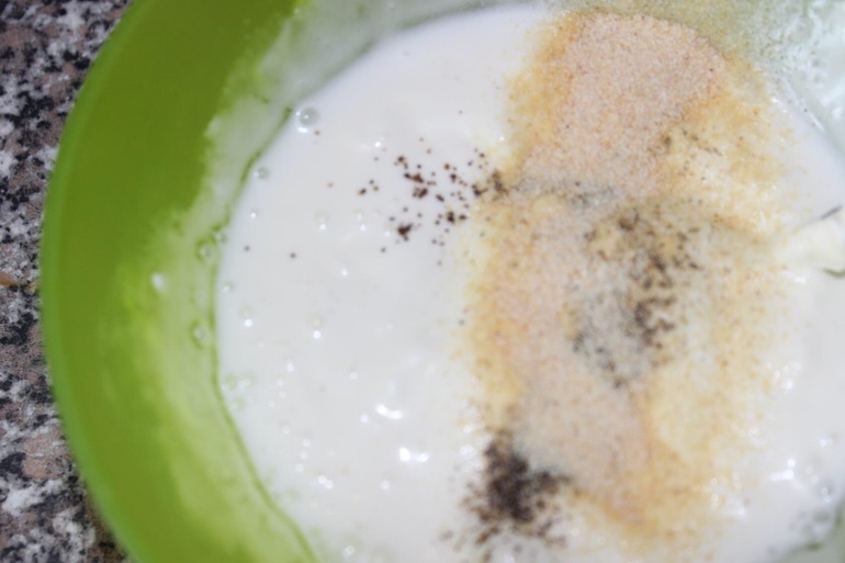 Смешиваем йогурт( или сметана+вода) с чесноком и приправами, немного сахара и заливаем блюдо за 10 минут до готовности, при желании посыпаем сыром.