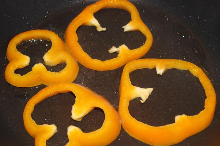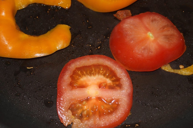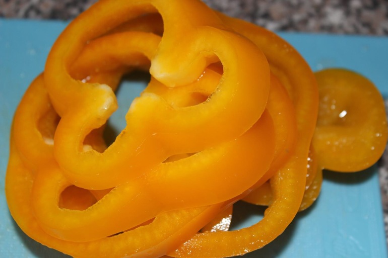 Перец и помидор нарезаем круглыми дольками примерно по 1см
