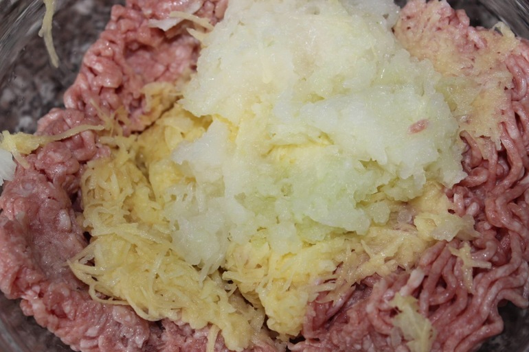 Натираем картофель на мелкой тёрке и лук на крупной (или мелко режим).