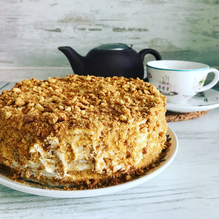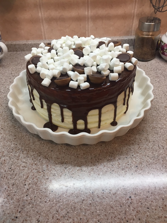 я просто пекла бисквит,крем-вареная сгущенка с маслом,и сверху шоколадной глазурью полила,а,ну и кофейная пропитка
