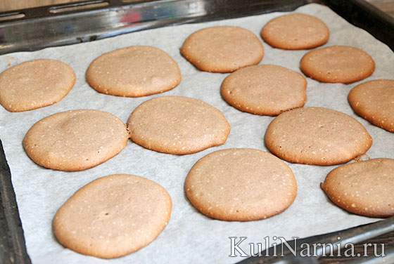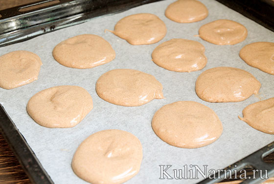 Ложкой набираем вязкую массу и выкладываем на противень, застланный пергаментом, в виде лепешек. Соблюдаем дистанцию между «островками» теста, так как во время процесса выпечки они слегка увеличатся в размере. Отправляем противень в раскаленную духовку. Выпекаем бисквитные лепешки при температуре 180-190 градусов порядка 7-10 минут.