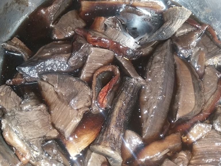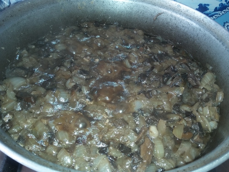 После обжарки влить воду от грибов и тушить почти до готовности.