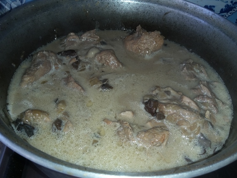 Влить в казан мучную смесь и половину стакана жирных сливок. Тушить вместе 10 минут: