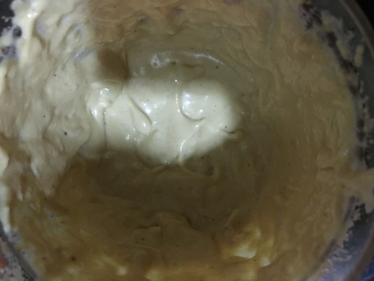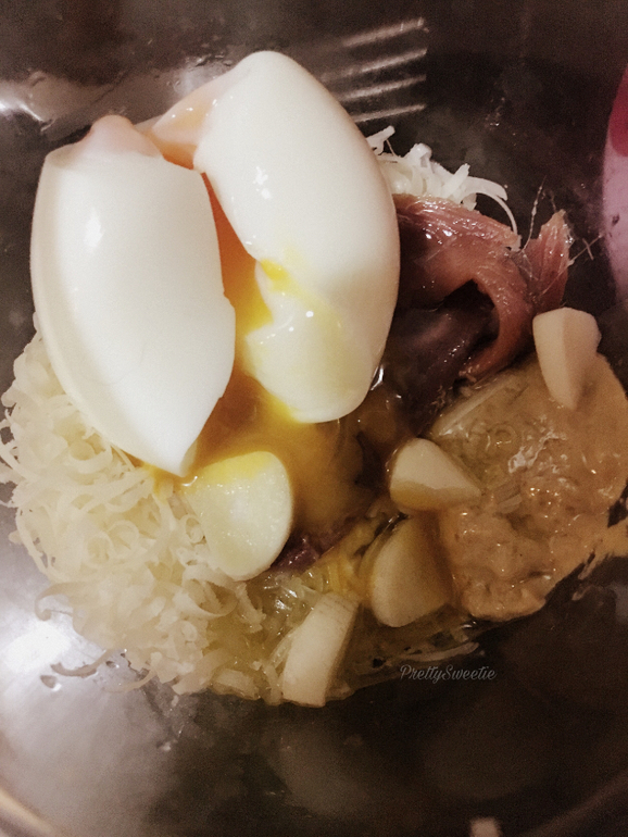 2. В чашу блендера: яйцо, 6 стл оливкового масла, горчица, анчоусы, тертый на мелкой тёрке сыр, лимонный сок, соль, перец. Бззз 10 секунд-готово.