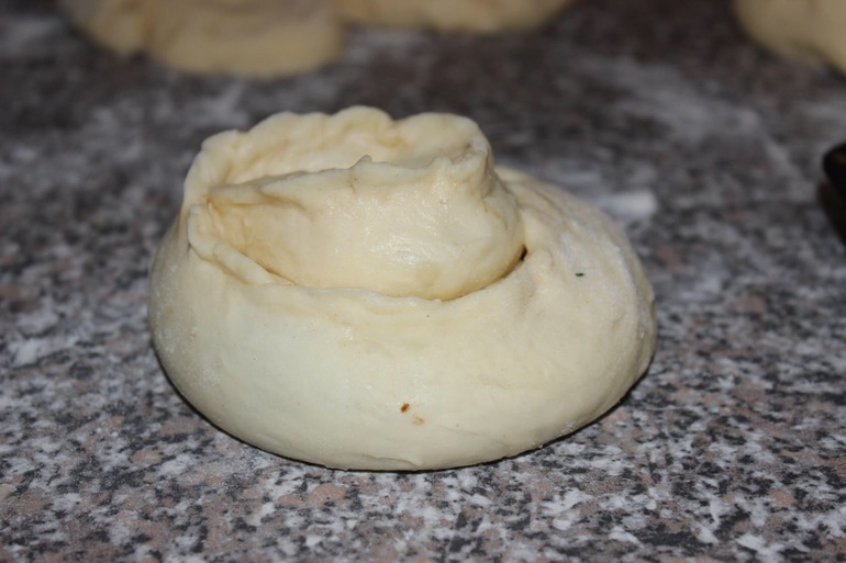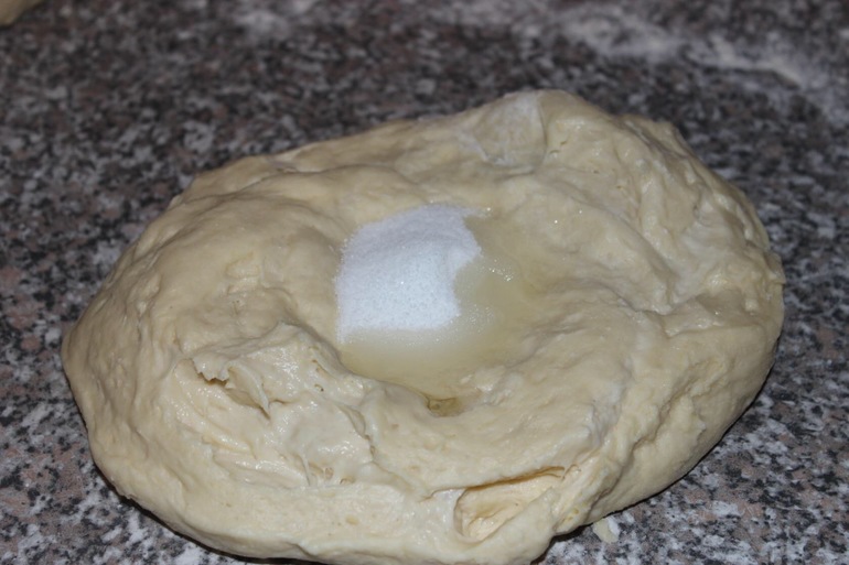 И месим тесто, добавляя немного муки, у меня сладкая начинка, поэтому мне хватило пол стакана сахара на половину теста, если на всё тесто, то стакан и можно печь наши булочки.