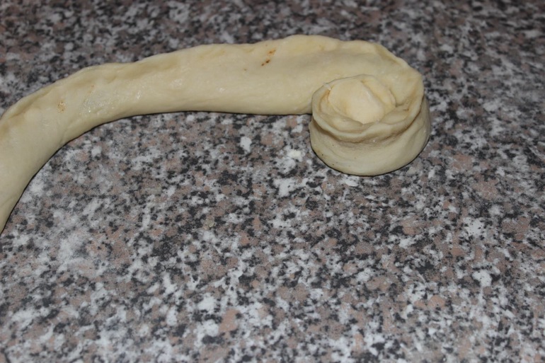 Раскатываем небольшие полоски, в середину укладываем начинку, залепляем и скручиваем в розочку