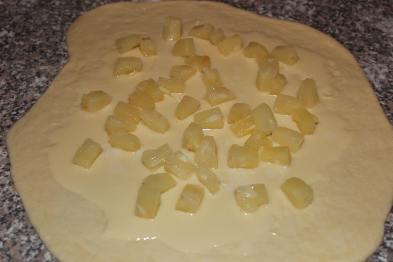 Вторые булочки- любимые булочки моего мужа- булочки в молоке, начинка обычно сливочное масло+сахар, но я смазываю сгущёным молоком- лучше варёным, но можно и таким и ананас (можно любой фрукт). Раскатываем лепёшку, промазываем её- не трогая края и укладываем немного фруктов.