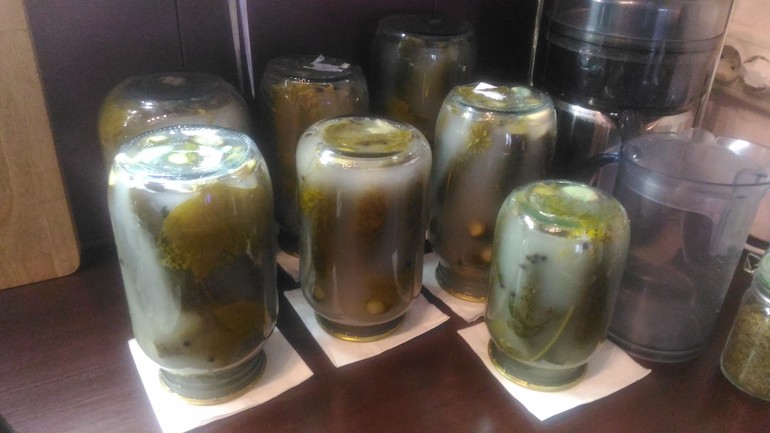 храню в квартире, и дело не в мутности, а в кол-ве рассола, хотя заливала до краев. Закрываю много лет, но такое впервые, вот и не знаю оставить как есть или долить воды :(((