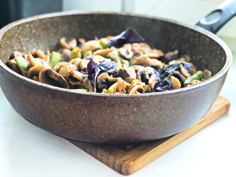 Раскалить сковороду, чуть обжарить лук, высыпать все грибы, когда грибы дадут сок, высыпать фасоль, томить под закрытой крышкой минут 10, потом посолить, когда грибы уже уменьшатся в объёме. В блендере измельчить помидоры с чесноком в соус. Когда в сковороде уже не будет сока от грибов и они начнут прижариваться, выливайте томатный соус. Буквально 2-3 минутки потомить, поперчить и выключить огонь 🔥. Подавать лучше со свежим базиликом.👍👍