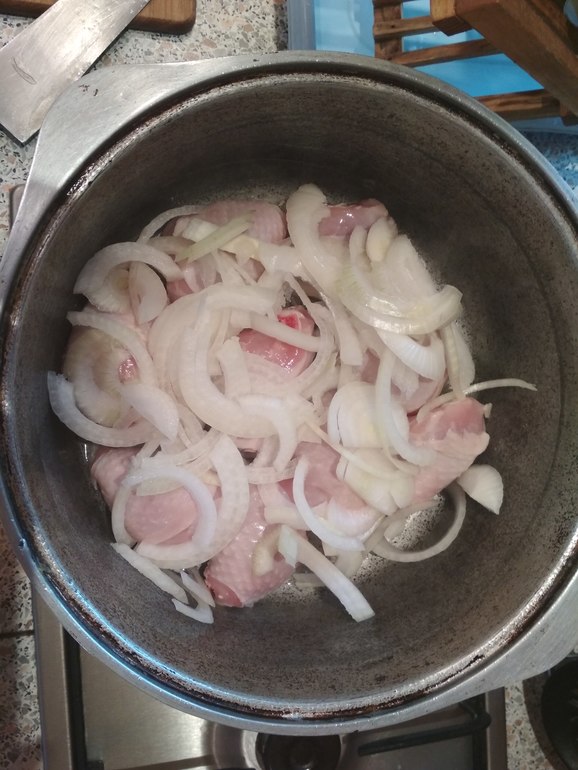 В большой латке на дне разогреваем растительное масло - слоем в полмизинца. В него кладем курицу кусками. Части могут быть любые, мне больше всего нравятся ножки. Сверху обильно посыпаем репчатым луком, нарезанным полукольцами.