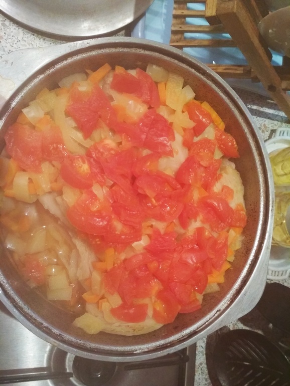 Сверху все это засыпаем помидорами и сладким перцем. Зимой в целях экономии их можно заменить на томатную пасту и сушеную паприку.