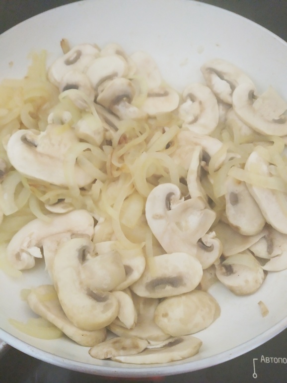 Лук режем полукольцами и пассеруем на смеси сливочного и растительного масла. Чесок через пресс. Добавить щепотку сахара. Когда лук станет мягким, добавим грибы, нарезанные пластинами.