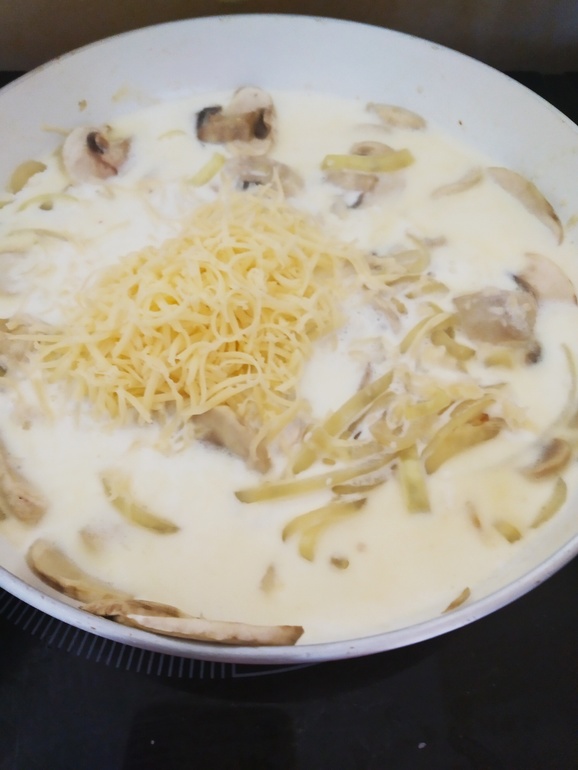 Далее добавляем упаковку сливок. Начинаем упаривать. Когда сливки упарились в половину - добавляем тертый на мелкой терке сыр.