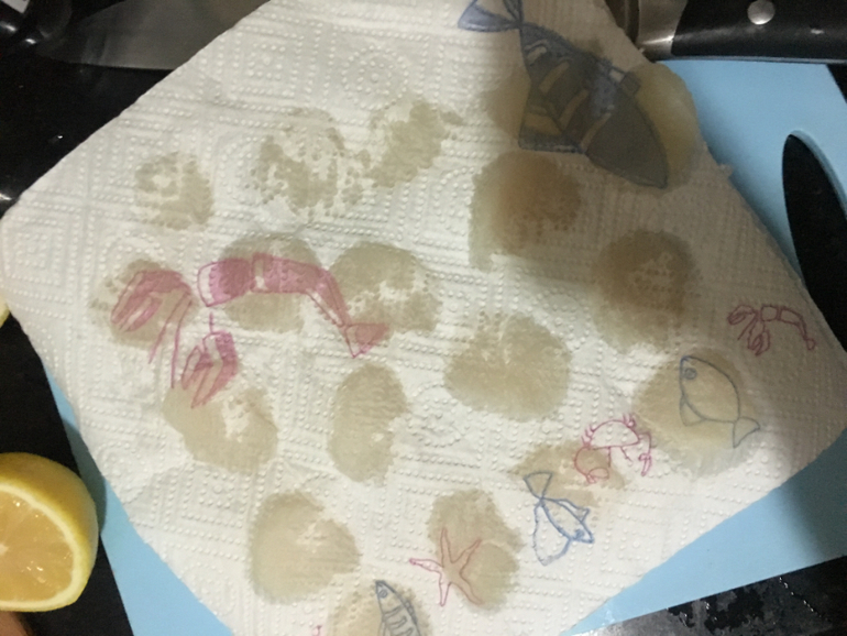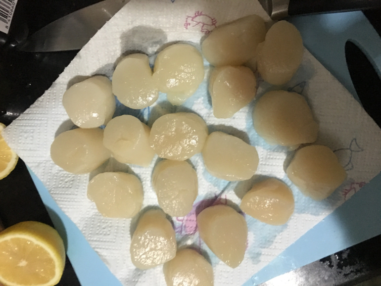 4. Преложить гребешки на бумажное полотенце, посолить, вспрыснуть лимоном.