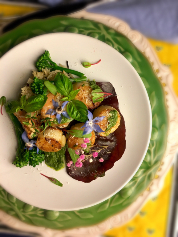 6. Выложить на тарелку рис, по краю риса соус, на него гребешки. По бокам положить брокколи. Если украшать зеленью, то ее расположить между гребешками. Очень просто, но красиво получается.
