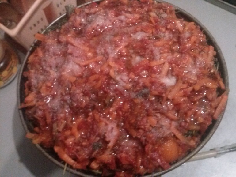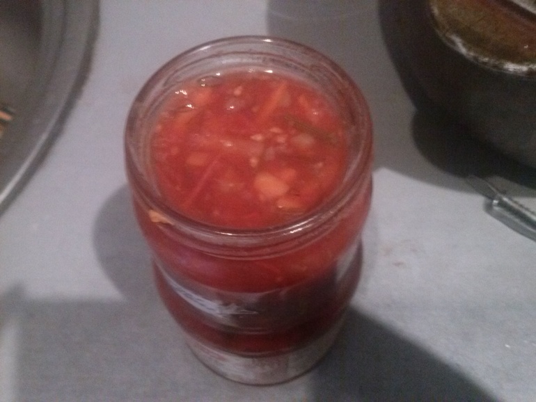 Также на зиму я консервирую заправку: в томатном соку варю морковь и болгарский перец, вот ею и залила, но это можно и не делать совсем, т.к. морковь уже положили, помидоры тоже, вот если только крупно нарезанный болгаргарский перец