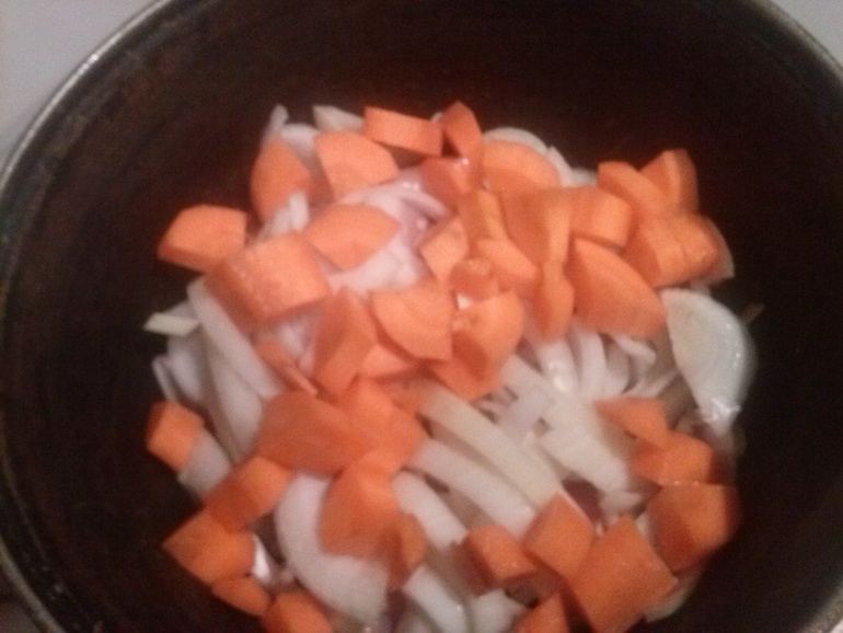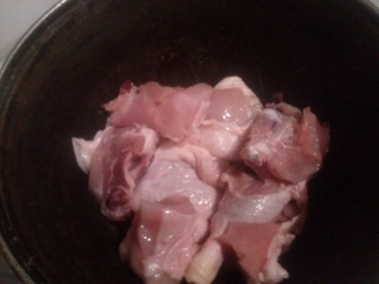 Конечно в данном посте и с условием Российской зимы много изменено под текущие реалити, но смысл уловите. Я это блюдо отношу к блюдам - что в холодильнике нашла и в том количестве которое есть. Ингредиенты расписывать из-за этого не буду, но основа это мясо или курица + овощи, и я кладу мало масла (если вы заметили по предыдущим постам) т.к. уже не могу позволить себе жирно поесть. В данном случае у меня пол курицы, разрубленная на 5-6 кусочков, складываем на дно казана (не горячего), можно посыпать молотыми семенами кинзы.