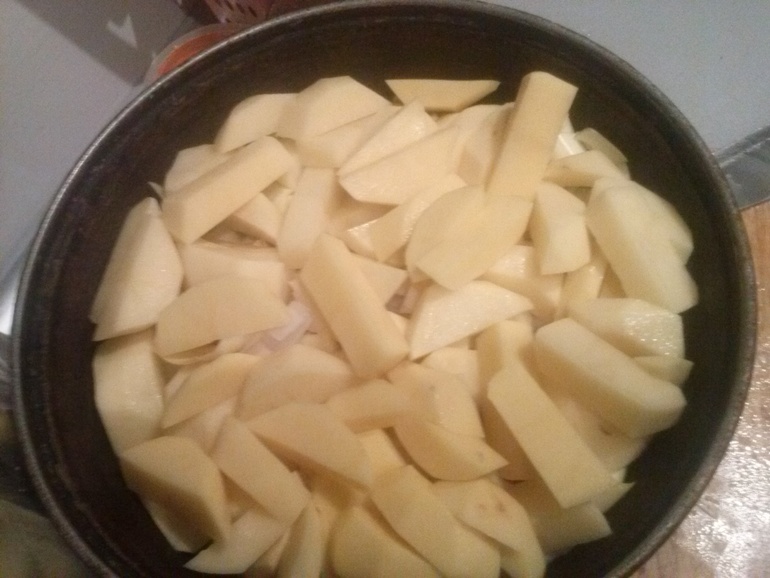 Теперь солим и и добавляем с 0,3-0,5 стакана растительного масла. Если у вас есть капуста, то крупно режем и сверху раскладываем, но у меня её не было. Всё, закрываем плотно крышкой и ставим на максимальный огонь минут на 15-20, затем делаем минимальный огонь и оставляем тушится еще час. Ни чего не мешаем, ни чего не приоткрываем и не наблюдаем, что творится внутри. На приготовление блюда для казана на 3л уходит - 15 минут на чистку, нарезку и раскладку, минут 15 на разогревание всего внутри и час на готовку.