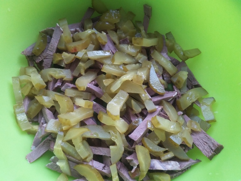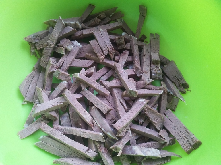 Сердце (говяжье, телячье) отварить с солью, лавриком, перцем, корнем петрушки. Остудить в бульоне. Нарезать брусочками: