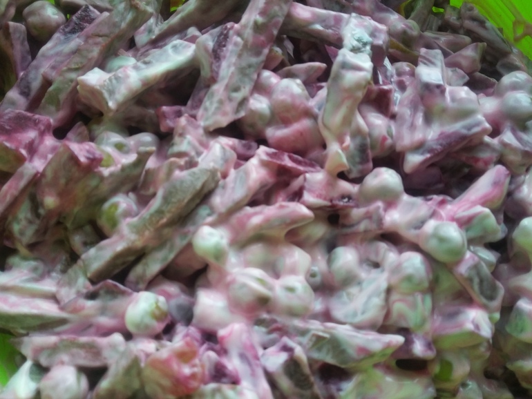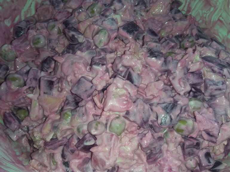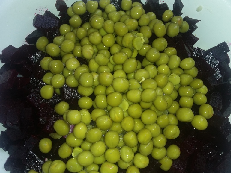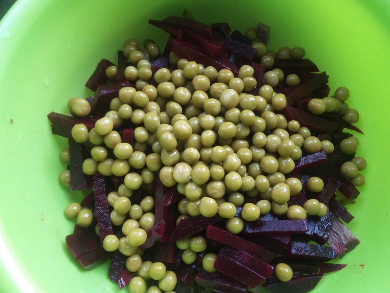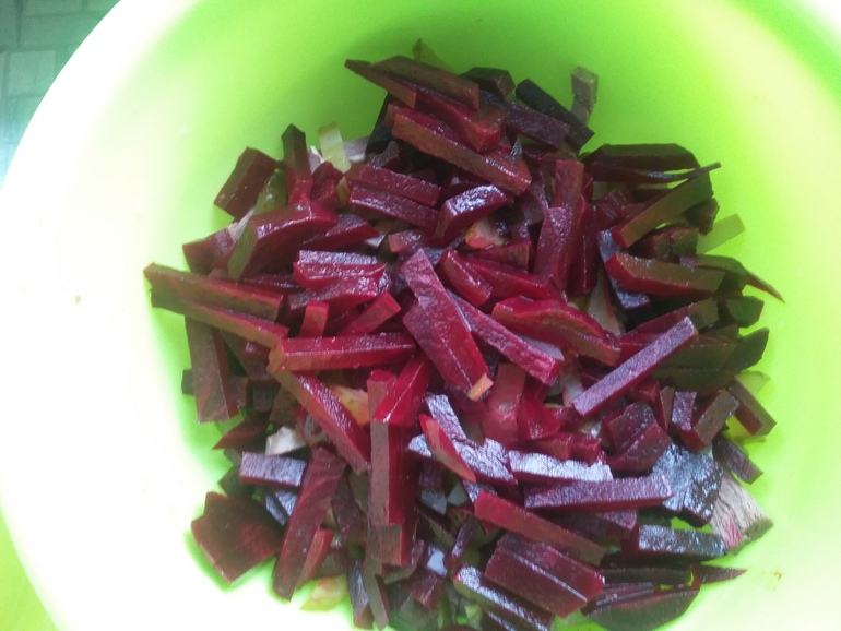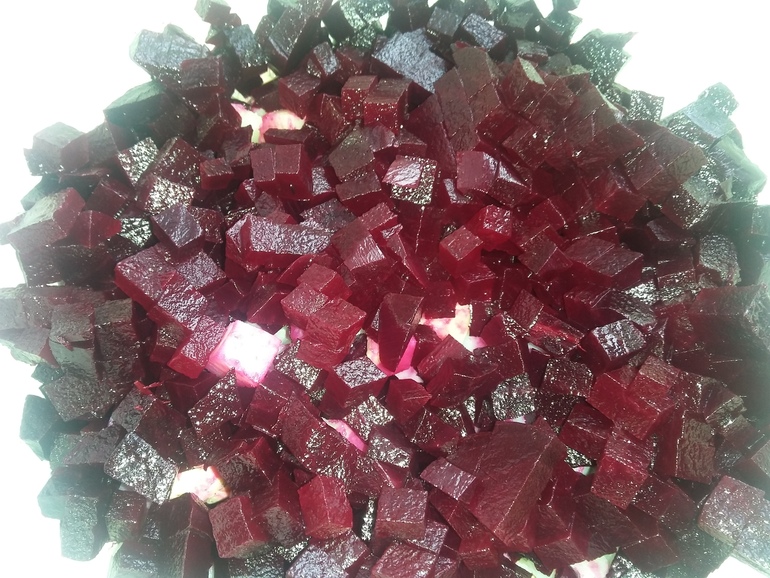 Следующей в салат идет отварная свекла, тоже брусочками:
