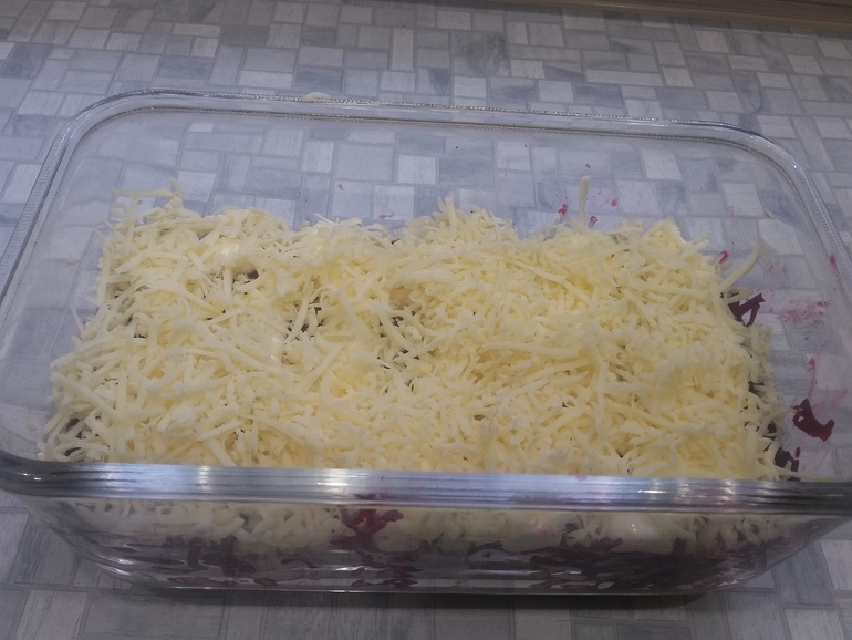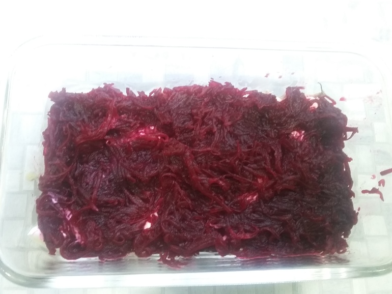 Отварить (а лучше запечь) свеклу. Натереть на мелкой терке. Положить слой в салатник: