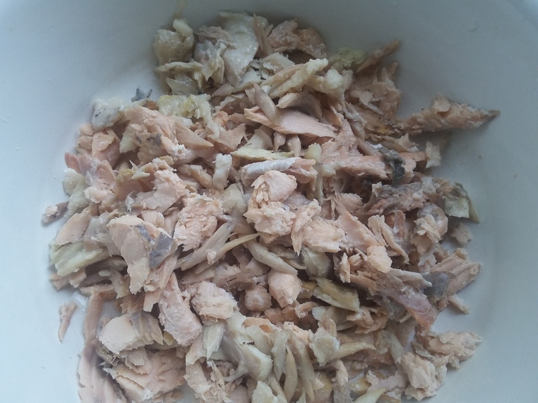 Следующий слой - размятая консервированная рыбка (вместе с жидкостью из банки):
