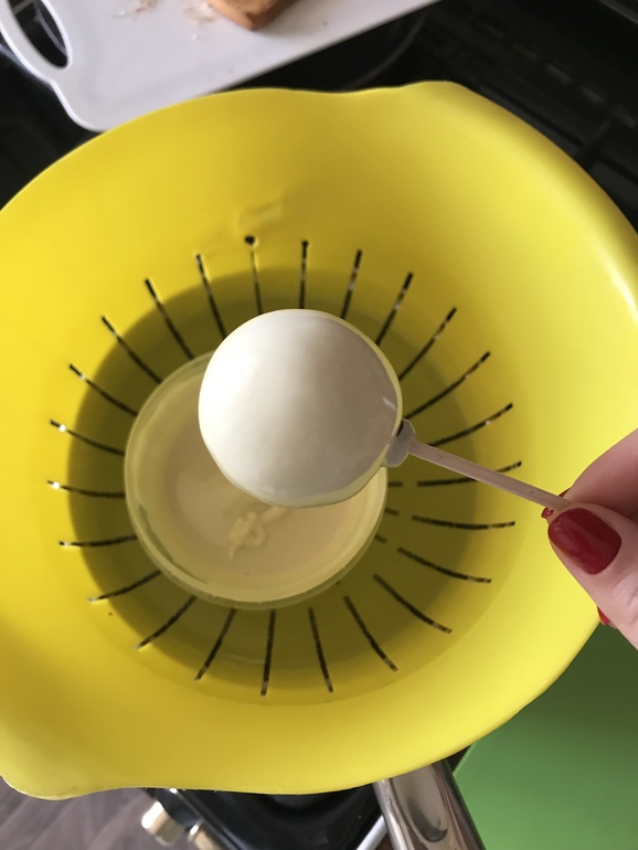 когда шоколад растопится, нужно взять палочки и обмакнув кончик в шоколад, вставить в наши попсы.