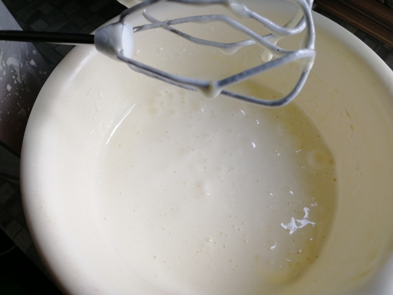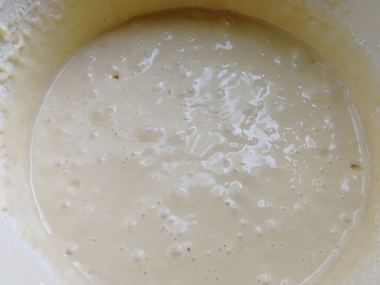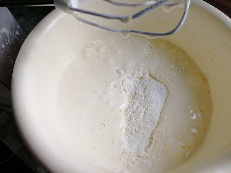 Продолжая перемешивать, по очереди добавлять мучную смесь и молочную: