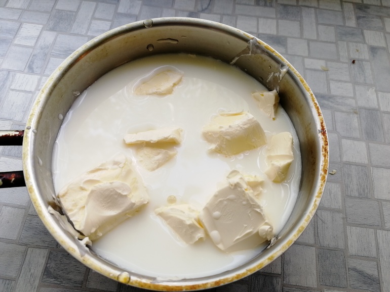 Поместить в миску 200 г сливочного масла и 1 стакан молока: