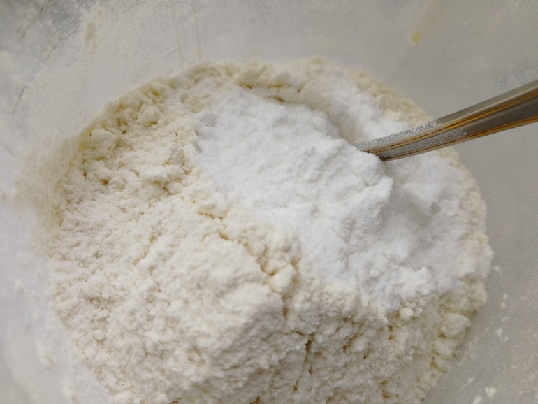Смешать в миске 700 мл (миллилитров, не грамм!) муки, 2 ч.л. с горкой разрыхлителя:
