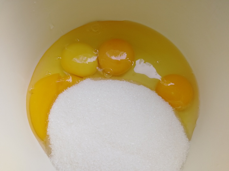 Поместить в чашу миксера 4 яйца, ванилин и 1 стакан песка: