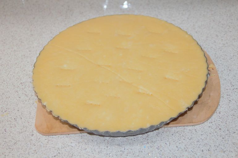 Вернемся к тесту. На бумаге для выпечки раскатываем половину теста, сформировав диск, и перекладываем его на дно формы для запекания, вдавив в саму форму. Лишнее тесто убрать. Из второй половину теста сделать диск таким же образом.