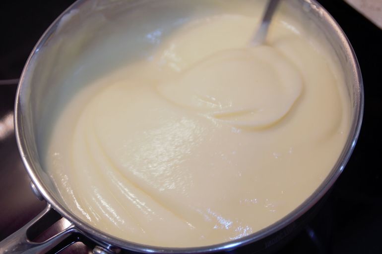 Тем временем удаляем кожицу лимона из молока, снимаем кастрюлю с огня и добавляем немного горячего молока в миску с яйцами. Все хорошо перемешиваем. Затем ставим кастрюлю с молоком на огонь и вливаем смесь с яйцами. Продолжаем варить на медленном огне минут 10 и постоянно помешивать венчиком, чтобы смесь не подгорела. Когда смесь станет густой, снимаем кастрюлю с огня.