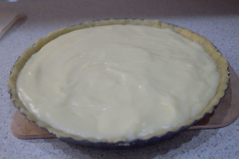 На дне посуды для выпечки, в которой находится первый диск, делаем вилкой дырочки и заливаем заварным кремом.