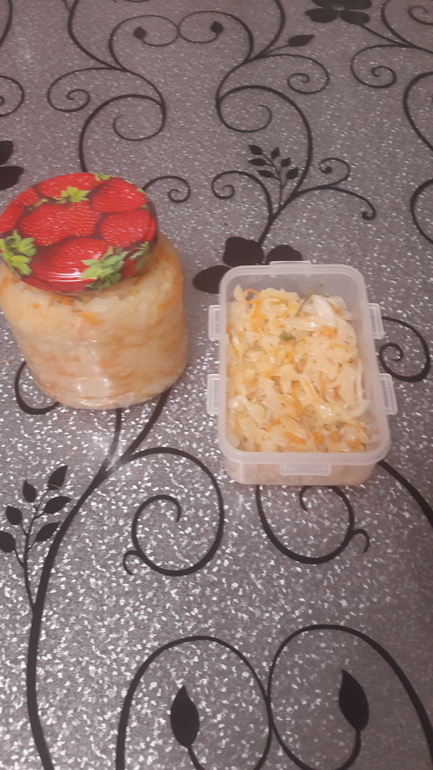 Вот готово, сегодня разложила по банкам. Вкусная, хрустит, хоть я и мяла. Пропорции по Вашему рецепту. Свекровь нервно курит в сторонке, это на работу уже в контейнер положила. Спасибо.