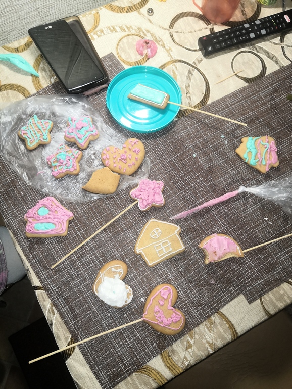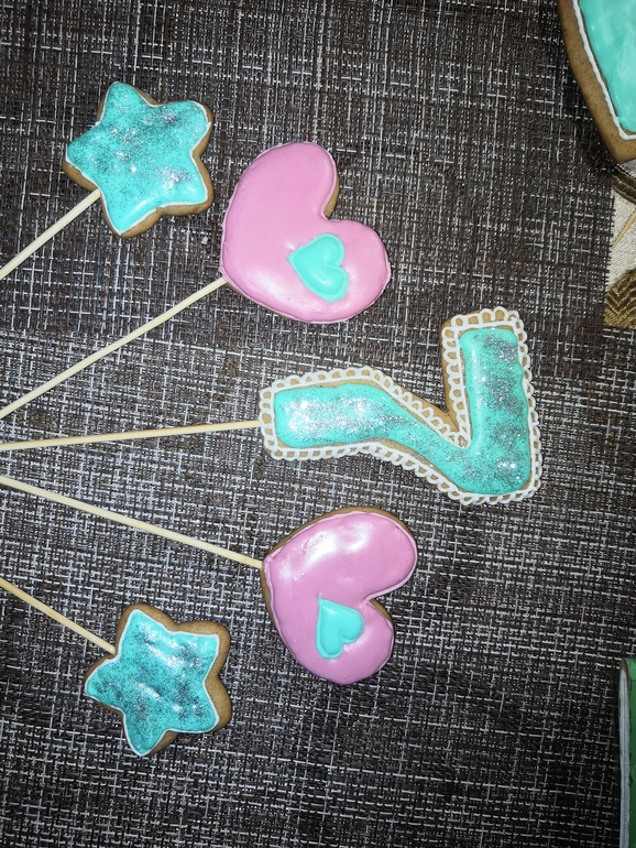 Печенья, пирожные, торты, пончики, кексыУ дочи завтра 7 лет. Решила попробовать украсить торт пряниками, ещё безешки будут. Айсинг для заливки густоват получился, но ничего, теперь буду знать)))