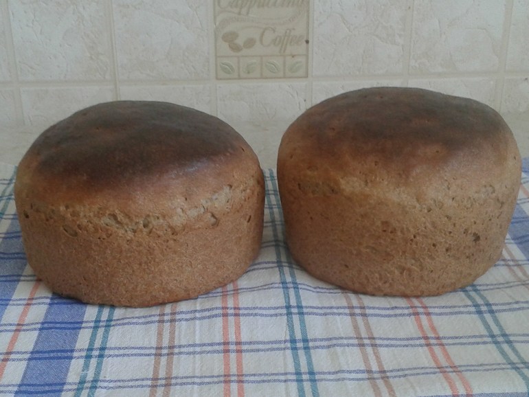 Смешайте все это и постепенно добавьте предварительно просеянную пшеничную муку.Замесите тесто. Когда оно будет готово, накройте миску с тестом пленкой или полотенцем и оставьте подходить на 1,5 часа. Когда время истечет,нужно обмять тесто и свормировав руками(руки нужно смазать немного растительным маслом) аккуратные будущие буханочки,положите в смазанные маслом формы для запекания. Верх можно выровнять рукой.Оставьте тесто в форме на 50 минут для расстойки,накрыв полотенцем. Разогрейте заранее духовку до 220 градусов и выпекайте хлеб 20 минут при 220 градусов,потом еще 20 минут при 150 градусах. По истечении времени достаньте,и с помощи кисточки смажте верх водой,накройте полотенцем и дайте остыть.