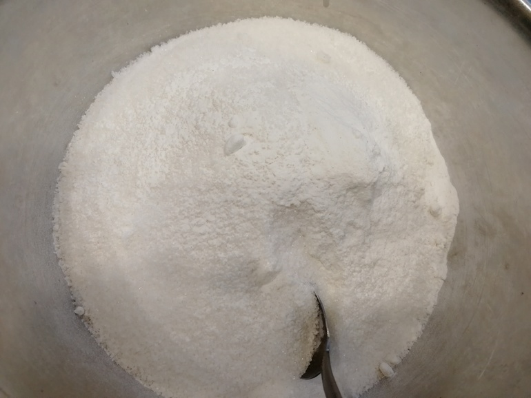 Положить в миску 4 стакана муки, 1 стакан сахара, 1 ч.л. разрыхлителя, щепотку соли: