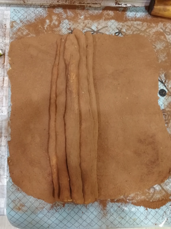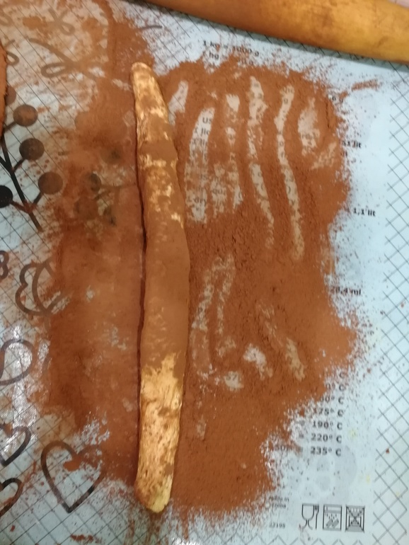 Оставшиеся 2/3 разделить на 5-6 частей. Каждую раскатать жгутиком на какао: