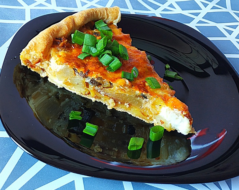 Пирог из слоёного теста с начинкой из грибов и картошки.