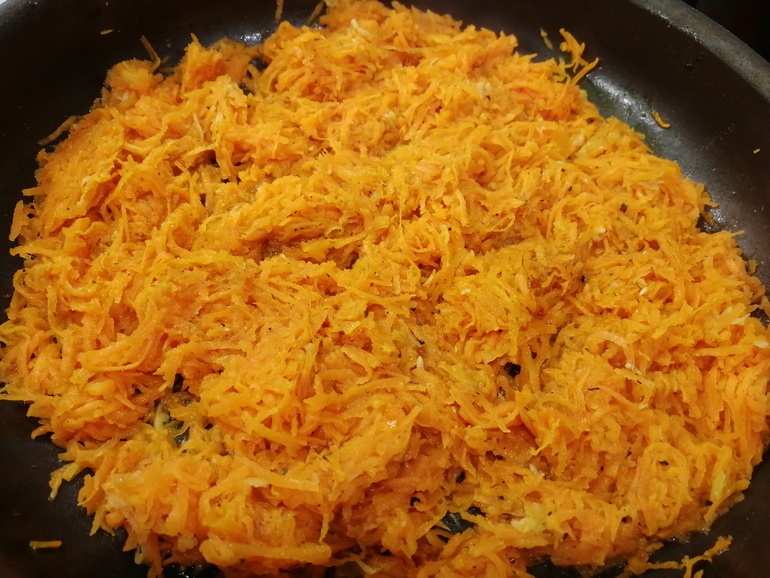 Потушить морковку на растительном масле (добавив потом чуть воды) с добавлением по вкусу сахара, соли, черного молотого перца, кориандра, паприки и молотой гвоздики (опционально):