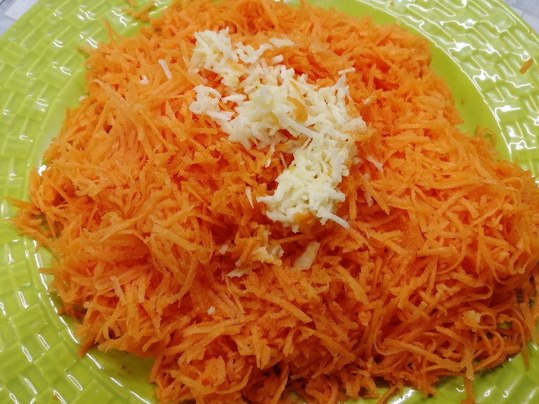 Добавить 4 зубка чеснока, пропущенных через чеснокодавку (или натертых на мелкой терке):
